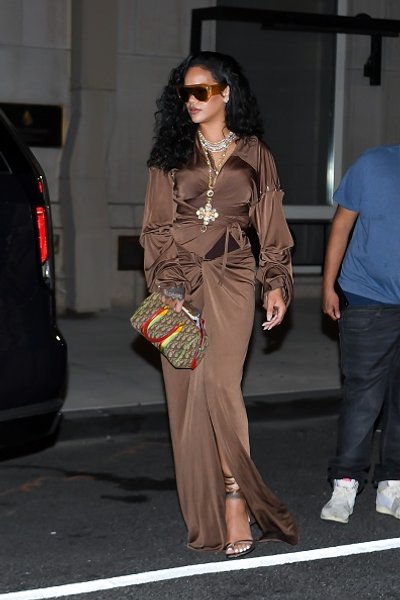 Співачка на вечірньому показі Alaia одягла вбрання від бренду від Jawara Alleyne. Верх складався з коричневого корсета, поверх якого модниця одягла вільну шовкову сорочку з подовженими рукавами. Мати двох дітей уклала своє темне волосся об'ємними хвилями, які спадали їй на плечі. Як аксесуари вона вибрала сонцезахисні окуляри-авіатори з товстими лінзами Phoebe Philo і велике золоте намисто з хрестом Sabyasachi. Ріанна доповнила свій образ парою коричневих туфель з ремінцями від Manolo Blahnik.