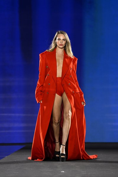 Кара Делевінь вийшла на подіум у розкішному червоному пальті (фото)