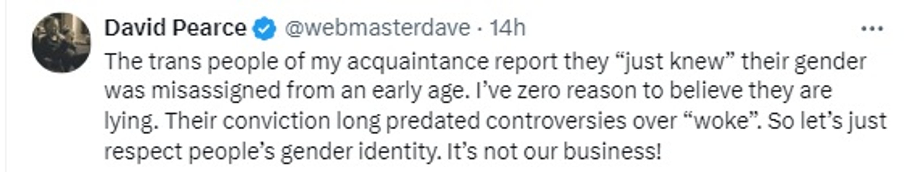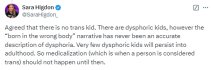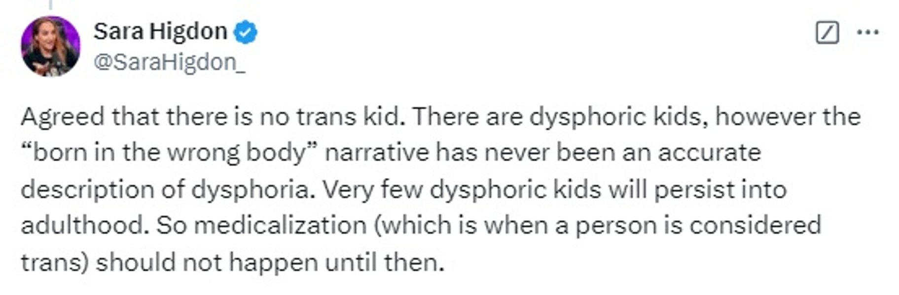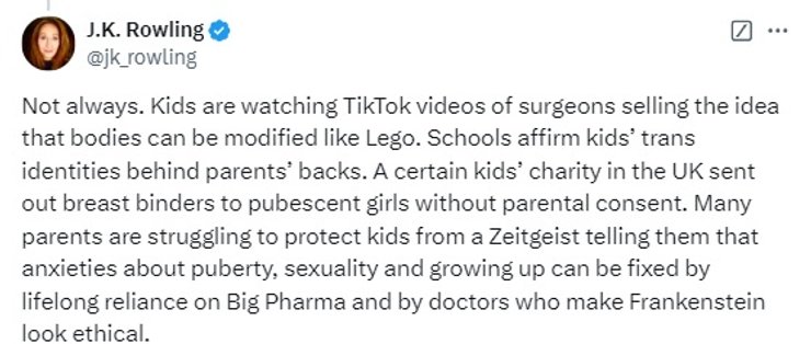 "Діти дивляться відео TikTok, де хірурги продають ідею про те, що тіла можна модифікувати, як Lego. Школи стверджують трансгендерну ідентичність дітей за спиною батьків. Якась дитяча благодійна організація у Великій Британії розіслала бандажі для грудей дівчаткам-підліткам без згоди батьків. Багато батьків щосили намагаються захистити дітей від духу часу, який говорить їм, що тривоги з приводу статевого дозрівання, сексуальності та дорослішання можна усунути, якщо все життя покладатися на Велику Фарму і лікарів, які змусять Франкенштейна виглядати етичним".
