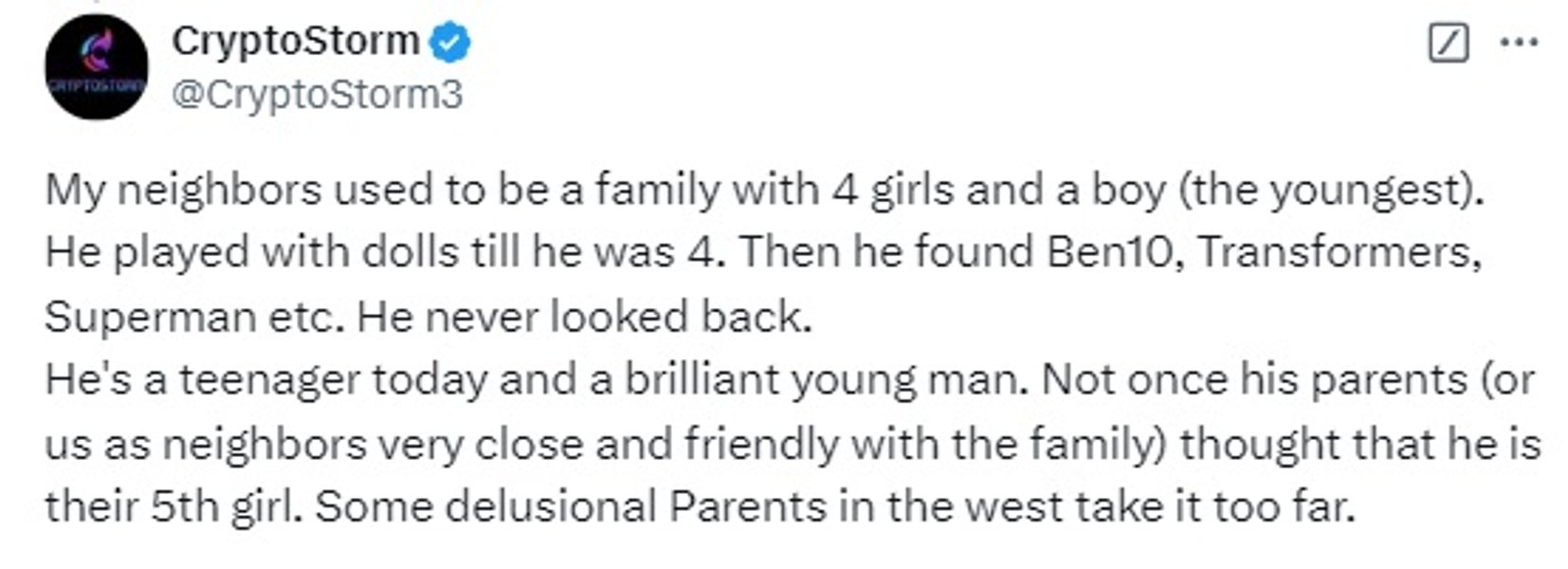"Мої сусіди раніше були сім'єю з 4 дівчатками і хлопчиком (наймолодшим). Він грав у ляльки до 4 років. Потім він знайшов Бена 10, Трансформерів, Супермена тощо. Він ніколи не озирався назад. Сьогодні він підліток і блискуча молода людина. Жодного разу його батьки (або ми, сусіди, дуже близькі і доброзичливі з родиною) не думали, що він їхня п'ята дівчинка. Деякі божевільні батьки на заході заходять надто далеко", "На основі цього немає трансгендерних дітей", – зазначають користувачі.