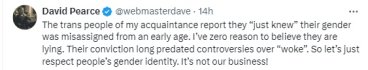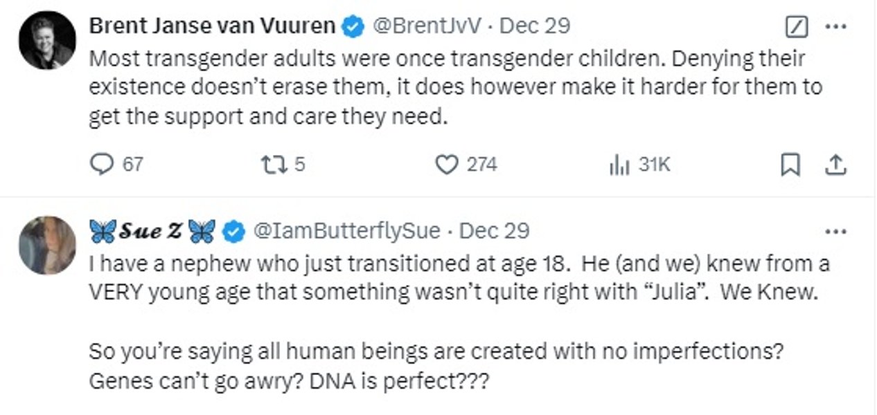 "Більшість дорослих трансгендерів колись були дітьми-трансгендерами. Заперечення їхнього існування не стирає їх, проте ускладнює для них отримання необхідної підтримки та догляду", "У мене є племінник, який щойно здійснив перехід у 18 років. Він (і ми) знали з ДУЖЕ раннього віку, що з "Джулією" щось не так. Ми знали. То ви кажете, що всі люди створені без недоліків? Гени не можуть помилятися? ДНК ідеальна?", "Трансгендери з-поміж моїх знайомих кажуть, що вони "просто знали", що їхня стать була неправильно визначена з раннього віку. У мене немає жодних підстав вважати, що вони брешуть. Їхня переконаність виникла задовго до суперечок про "те, що прокинулося". Тож давайте просто поважати гендерну ідентичність людей. Це не наша справа!" – пишуть вони.