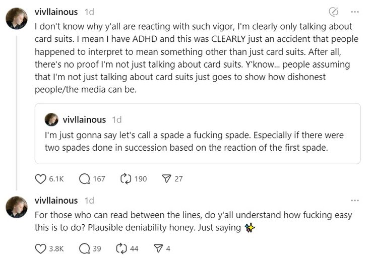 "Я просто скажу, давайте називати речі своїми іменами. Особливо якби були зроблені дві піки поспіль, ґрунтуючись на реакції першої піки. Я не знаю, чому ви всі так бурхливо реагуєте, я явно говорю тільки про масті карт. Я маю на увазі, що у мене СДУГ, і це була ЯВНО просто випадковість, яку люди випадково інтерпретували як щось інше, ніж просто масті карт. Зрештою, немає жодних доказів, що я говорю не тільки про масті карт. Знаєте... люди, які припускають, що я говорю не тільки про масті карт, просто показують, наскільки нечесними можуть бути люди/ЗМІ", — написала вона.