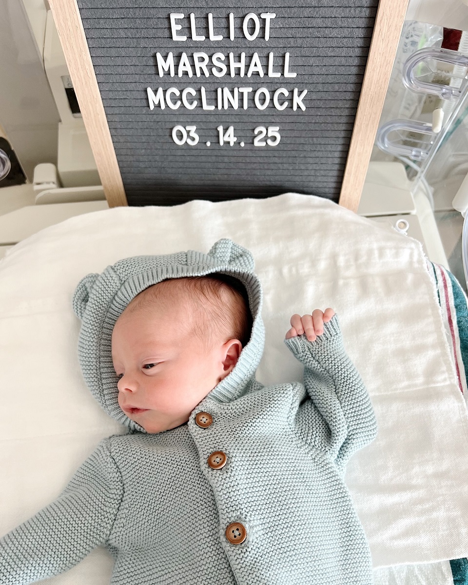 На знімку — хлопчик у світло-блакитному светрі з капюшоном. Над його головою табличка з написом "Елліот Маршалл МакКлінток 03.14.25", що свідчить про те, що Скотт назвала свого маленького хлопчика другим ім'ям на честь свого батька, чиє справжнє ім'я – Маршалл Метерс.