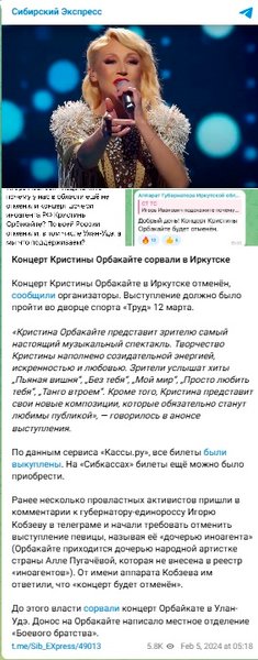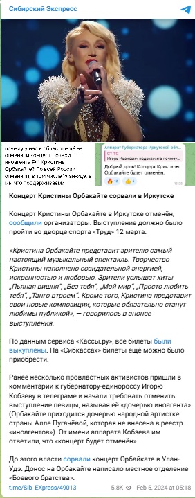 У грудні 2023 року повідомлялося, що Орбакайте повернулася зі США в Росію, після чого виступила на концерті "Песня года" і в ефірі "Первого канала". Однак у лютому минулого року концертний тур артистки Сибіром повністю скасували після кількох анонімних коментарів у телеграм-каналі губернатора області, де її назвали дочкою "іноземного агента".