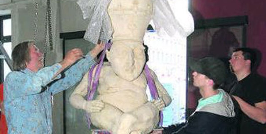 Выполненная из бетона "Империа" высотой 9 м и весом 18 т представляет собой фигуру средневековой блудницы с поднятыми руками. На ладонях у нее примостились двое обнаженных мужчин: один в императорской короне, другой в папской тиаре, передает Lenta.ru.