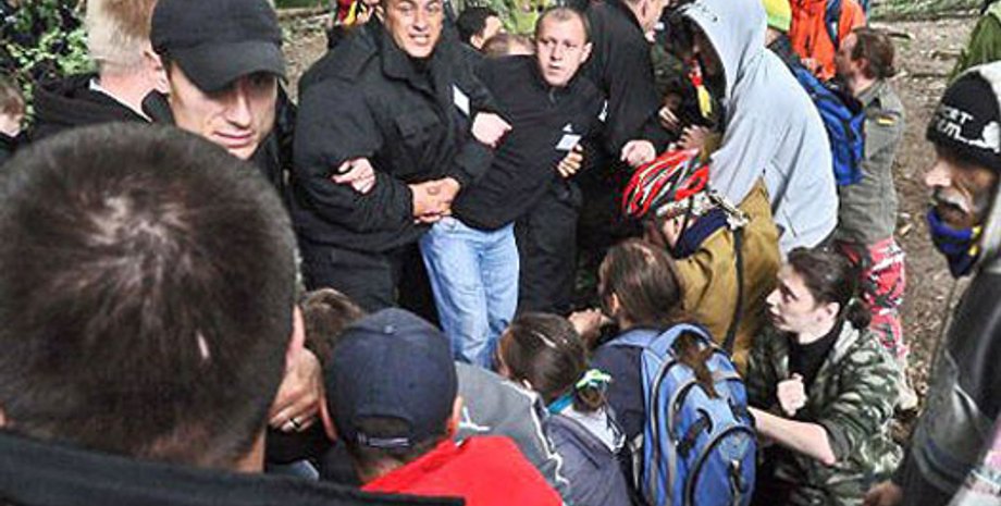 Как сообщает Украинская правда, защитники парка перегородили проезд своими телами.