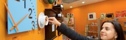 Екатерина Данько, частный предприниматель из Киева, с интересом рассматривает настенные часы в одном из столичных магазинов подарков. Пользоваться такими часами не очень удобно: на них лишь четверть от привычного циферблата.