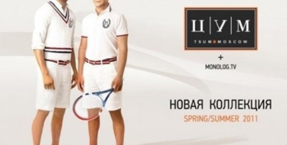 Довершает плакат надпись "Новая коллекция spring-summer 2011", фирменный знак Московского универмага ЦУМ и ссылка на сайт monolog.tv.