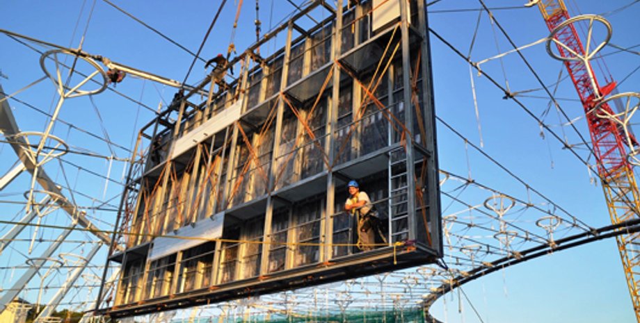 Табло немецкого производства сначала собрали на земле, а затем подняли и закрепили под вантовой конструкцией крыши на 6 тросах. Максимальный вес каждого табло вместе с монтажной конструкцией - 9,5 тонн.