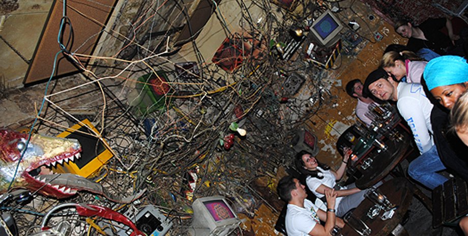 Когда пытаешься представить себе это заведение в дневном свете, становится жутковато, но ночью Szimpla Kert очаровывает деланной безалаберностью, потрепанными временем стенами, заклеенными пожелтевшими открытками и разрисованными граффити. Под потолками в темных закоулках висят сотни проводов, в которых путаются старые пузатые мониторы и транзисторы. На мониторах вспыхивают и танцуют под грохочущую музыку графические картинки.