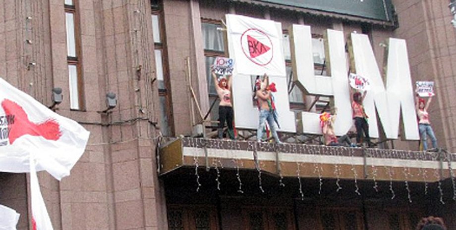 Активистки движения FEMEN проводят акцию на балконе над входом в Центральный универмаг Киева со стороны улицы Богдана Хмельницкого