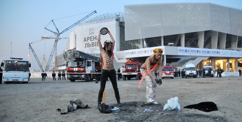 Двух полураздетых активисток движения FEMEN задержали перед торжественным открытием стадиона Львов-Арена, на котором будут проходить матчи футбольного турнира Евро-2012