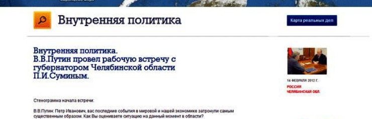Тем не менее, 14 февраля этого года на сайте ЧтоСделалПутин.рф выложили информацию о разговоре Путина с Суминым, который якобы произошел именно в этот день. На сайте также была представлена стенограмма встречи, которая, правда, теперь уже удалена. Впрочем, следы прокола сохранились в кэше Google: Путин: "Петр Иванович, вас последние события в мировой и нашей экономике затронули существенным образом. Как вы оцениваете ситуацию на данный момент в области?". Сумин: "На данный момент, действительно, трудновато. Но область живет, область работает. Я думаю, что никаких серьезных срывов мы не допустим ни по выплатам заработных плат, ни с работой предприятий".