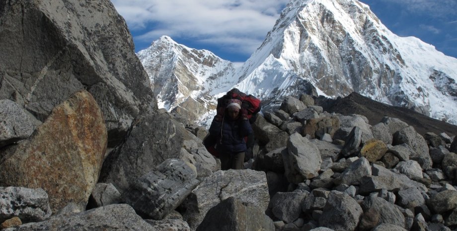 О носильщиках стоит сказать отдельно. В отсутствие какого-либо транспорта его роль выполняют сами непальцы. Точнее, шерпы — народность, обитающая в окрестностях Эвереста. В коробах, корзинах и сумках, повешенных на шею, они перетаскивают тяжести на любую высоту. Причем, не напрягаясь, несут такой груз, который даже неслабый европеец еле-еле приподнимет.