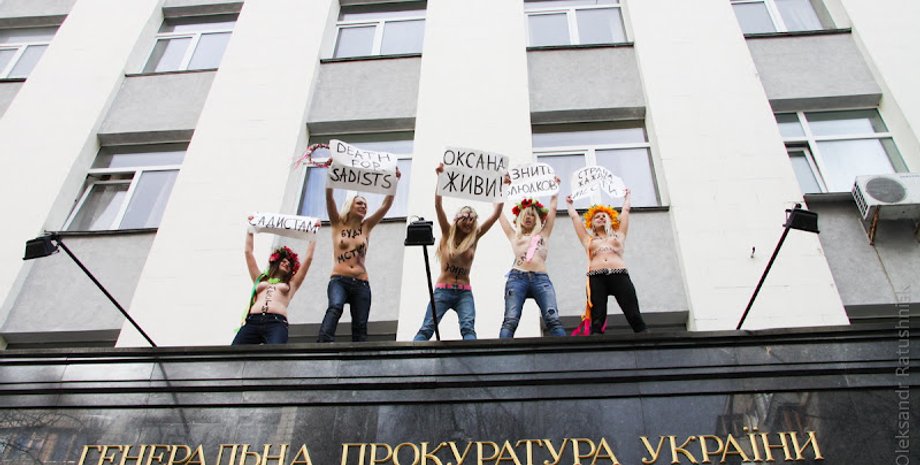 Полураздетые девушки оккупировали вход в Генеральную прокуратуру Украины и забрались на выступающий карниз здания. Активистки скандировали: "Оксана, живи!, Смерть садистам! и Казнить ублюдков!".