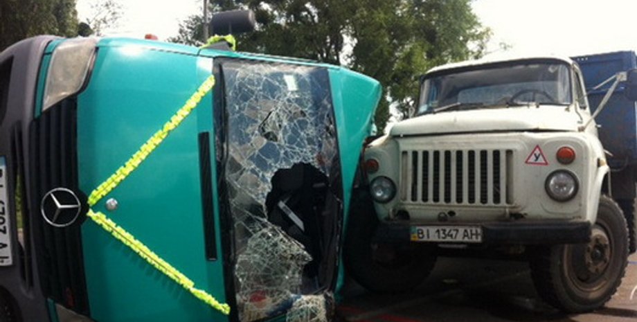 По данным МВД, ДТП произошло 13 июля около 13:00 на углу улиц Шведская могила и Зиньковская. В микроавтобусе ехали 17 пассажиров на свадьбу в Диканьський район. Как удалось установить, 48-летний водитель микроавтобуса не предоставил преимущество в движении грузовику под управлением 46-летнего полтавчанина, "что привело к опрокидыванию автобуса на проезжую часть с дальнейшим его столкновением с грузовиком".