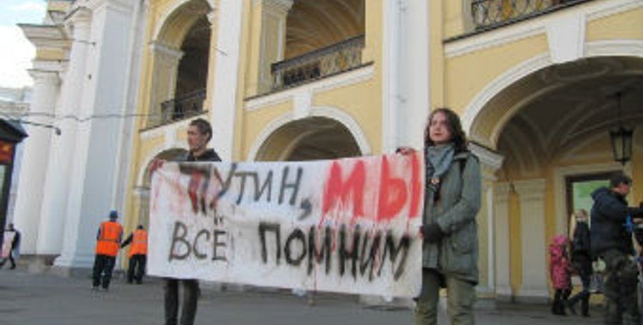 Оппозиционеры встали у выхода из метро Гостиный двор с плакатом Путин, мы все помним! и, скандируя лозунги Россия без Путина, Россия будет свободной!, зажгли дымовую шашку. Их задержали только после окончания акции.
