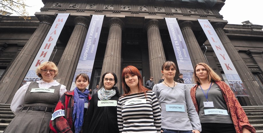 Повязки со словом "Протестую" сотрудники главного художественного музея страны надели 17 октября. Однако началась эта история в апреле, когда Минкульт уволил с должности предыдущего директора НХМУ Анатолия Мельника. По официальной версии — за низкую посещаемость музея. Сам Мельник предполагал, что ему отомстили за разглашение информации о том, что в Кабмине бесследно исчезли четыре ценные картины Николая Глущенко, ранее переданные туда Нацмузеем. Открытое в связи с этим уголовное дело до сих пор безрезультатно расследует столичная милиция.