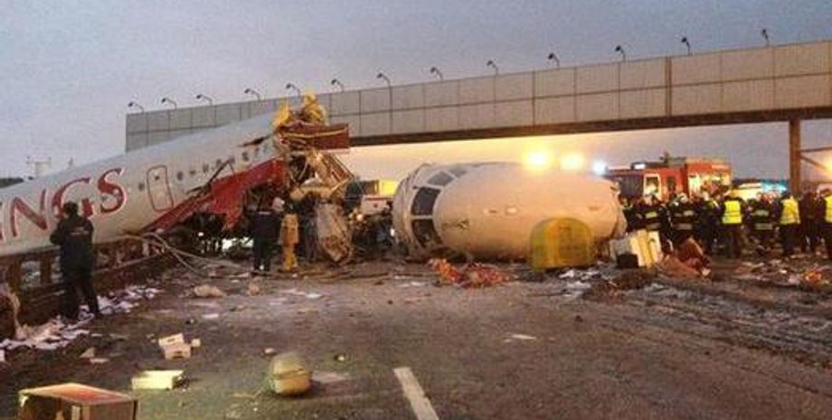 выехал за пределы взлетно-посадочной полосы и развалился на три части.