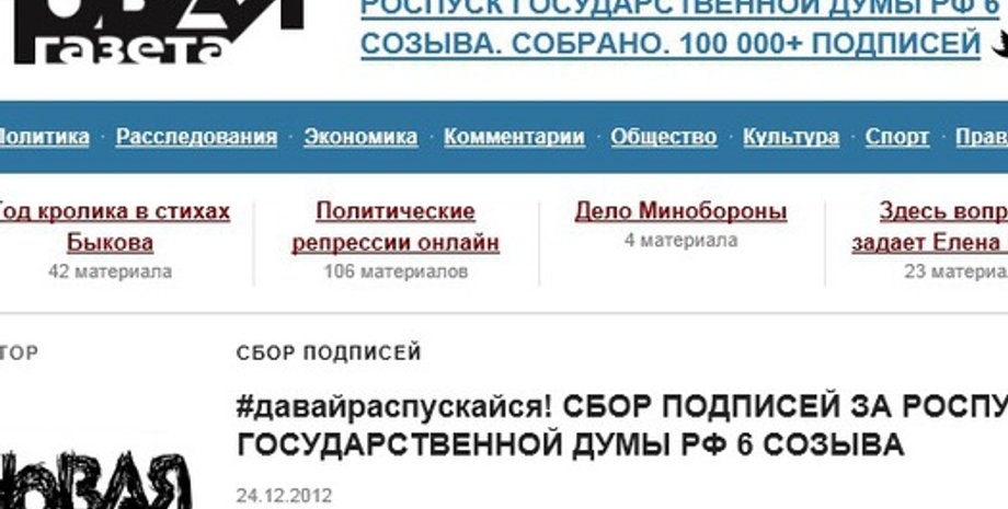 Напомним, Новая газета начала сбор подписей за роспуск Государственной Думы сразу после принятия депутатами закона Димы Яковлева, запрещающего усыновление российских детей гражданами США.