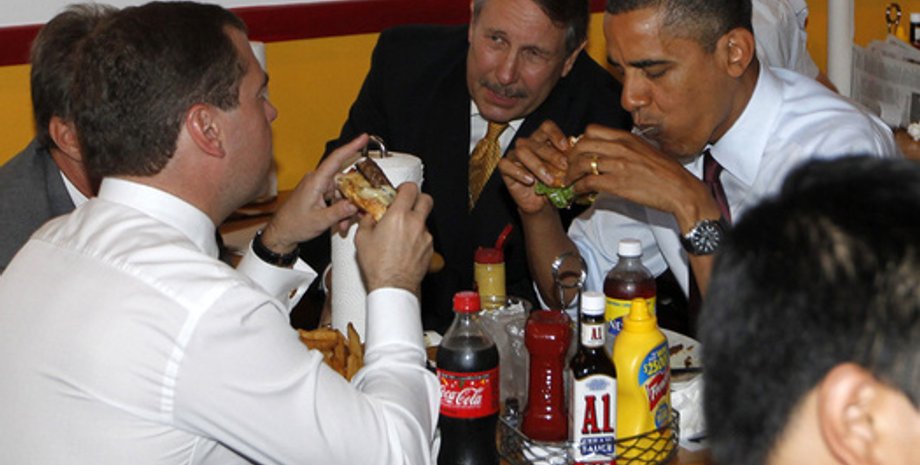 Закусочная дипломатия. Обама накормил Медведева гамбургерамиНапомним, в июне