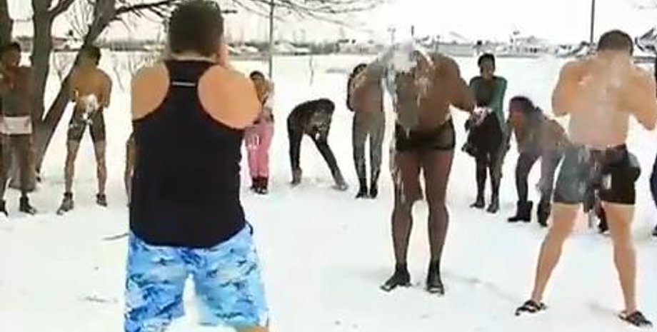 Молодые людей из Индии, Пакистана и стран Африки решили приобщиться к национальной традиции празднования Крещения, выбежав на улицу и начав обтираться снегом.