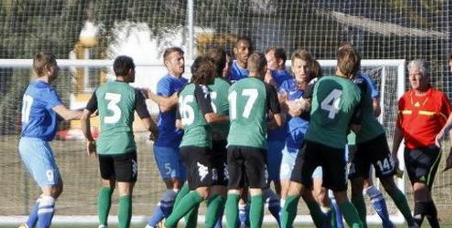 Страсти вспыхнули после того, как Руслан Ротань грубо подкатился в центре поля под соперника, хотя и до этого команды играли очень агрессивно и жестко. Как итог, поединок был прерван в концовке первого тайма.