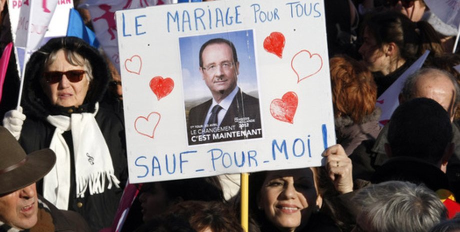 Легализация однополых браков - одно из предвыборных обещаний президента Франсуа Олланда. Сегодня во Франции разрешены гражданские союзы однополых пар, однако социалисты решили легализовать браки между гомосексуалистами и предоставить возможность таким семьям усыновлять детей. Против этого шага выступают представители правой оппозиции и католическая церковь.