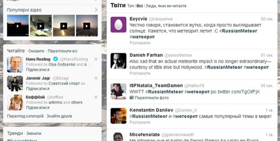 В сервисе микроблогов Twitter пользователи создают аккаунты челябинского метеорита, публикую в них новости и шутки о метеоритном дожде в Челябинской области