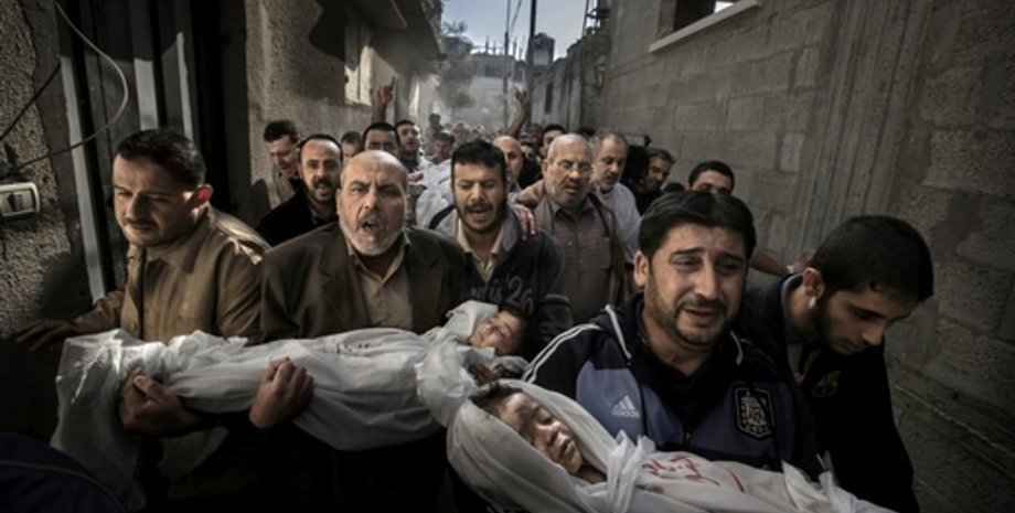 На фото изображена процессия мужчин в Газе, на руках двоих из них тела погибших детей, одетых в саван.