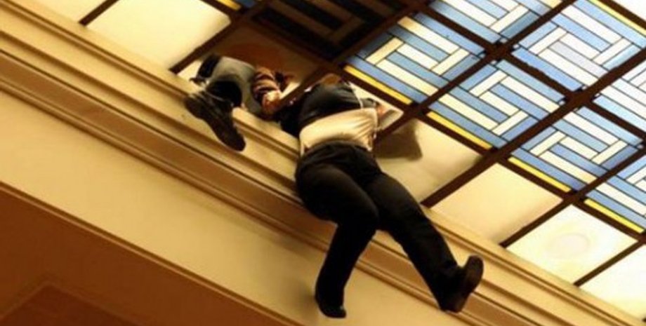Женщине чудом удалось удержаться и не упасть. Отметим, высота потолка в зале заседаний превышает 10 метров.