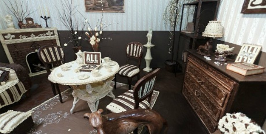 В торговом центре Минска открылась шоколадная комната, в которой представлены 50 шоколадных предметов, среди которых предметы мебели, камин, посуда, картины, ковер и кухонные принадлежности