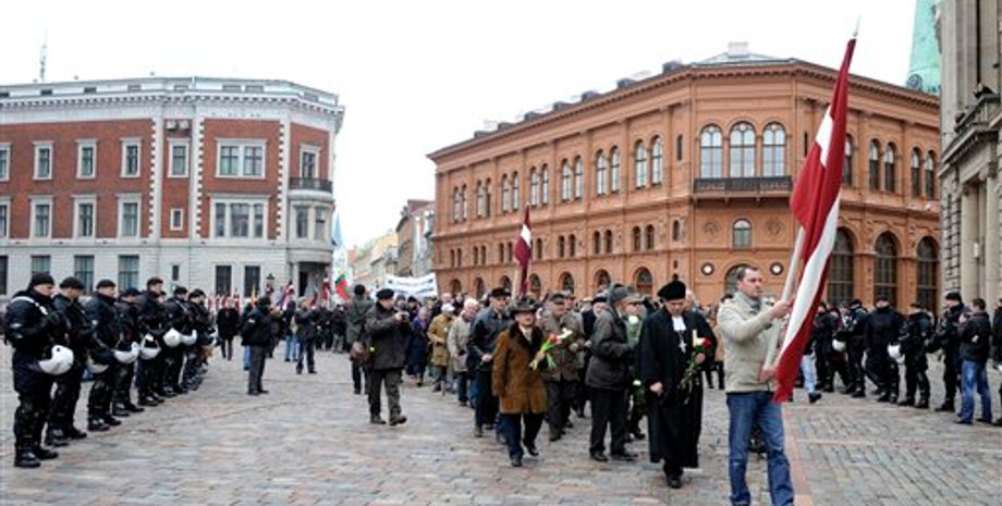 Полиция оцепила площадь около памятника Свободы в центре столицы Латвии, чтобы не допустить провокаций. В этом году в шествии принимают участие несколько сот человек, в том числе депутаты Сейма, подростки и совсем маленькие дети, которых привели родители.