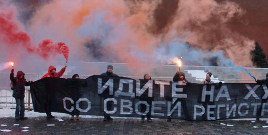 По данным СМИ, несколько активистов развернули баннер с надписью "Идите на &%й со своей регистрацией", участники акции скандировали лозунги "Где мы живем - не ваше сучье дело", "Путин будет казнен", "Долой власть чекистов".