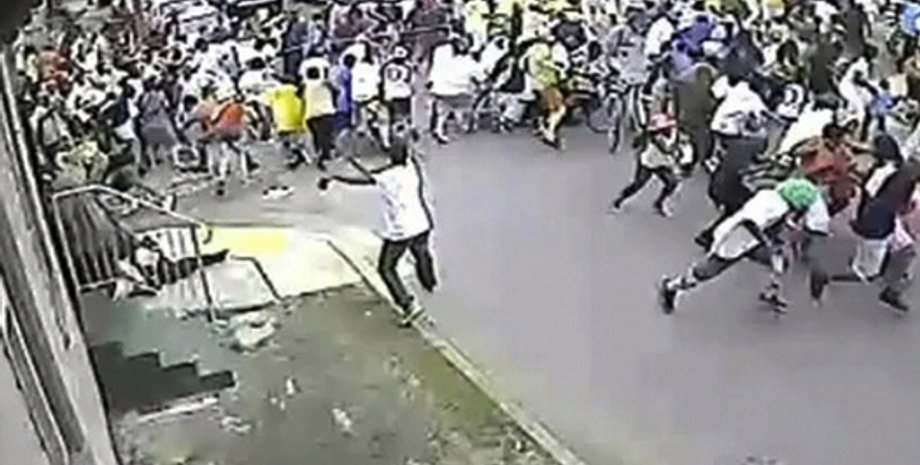На записи, которая длится полторы минуты, виден предполагаемый злоумышленник - темнокожий молодой человек в белой футболке. Сначала он стоит у стены здания, затем начинает движение вслед прошедшей толпе и достает из кармана оружие. На видео нет звука - на последующих кадрах видно лишь, как люди в панике разбегаются с перекрестка в разные стороны. Пострадавшие падают на асфальт, остальные сталкиваются, падают друг на друга, чтобы не попасть под пули. Маленький ребенок, находящийся буквально в пяти метрах от стрелявшего, успевает забежать за угол дома.