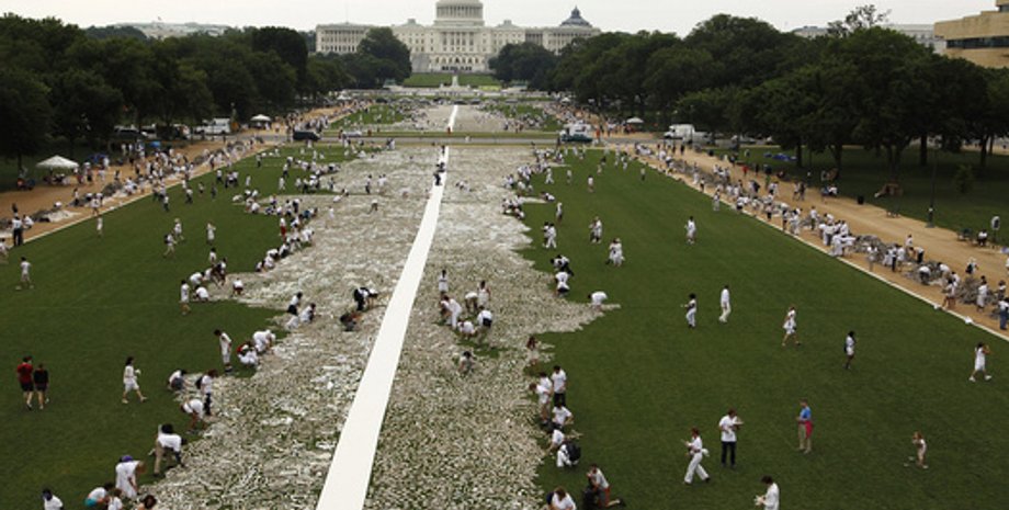 Кости, сделанные из картона, папье-маше и керамики, выложены на газонах на Национальной аллее перед Капитолием, где заседает конгресс США. Инсталляция просуществует до 10 июня.
