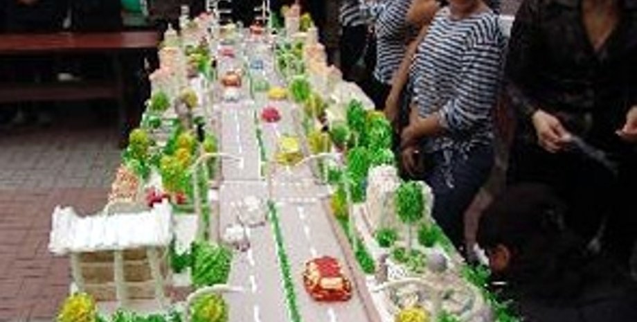 Шедевр кондитерского мастерства являет собой модель реконструированного проспекта Ленина – главной улицы Запорожья – с жилыми домами, стадионом, зданиями официальных учреждений и проезжающим транспортом.