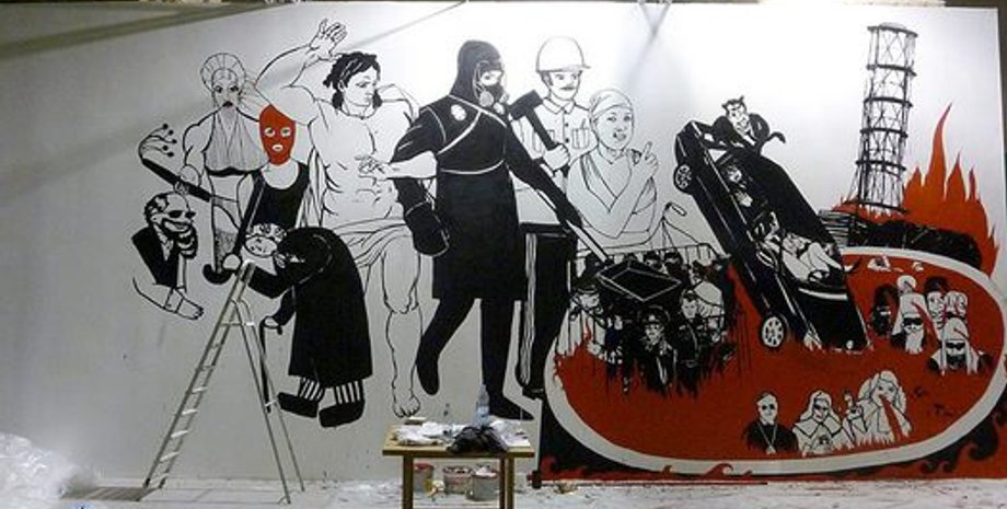 Он добавил, что его не пустили на выставку доделать работу. Кроме того, он узнал, что картину размером 11х5 метров закрасили черной краской.