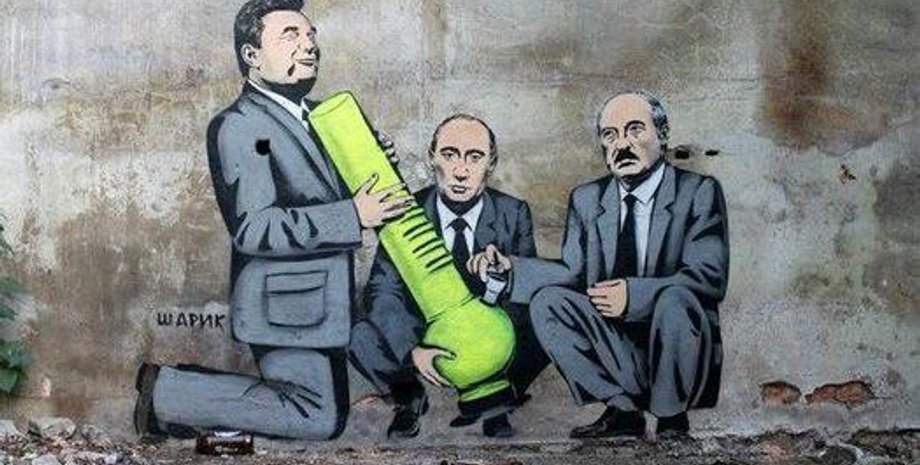Так, на новом граффити Шарика Янукович, Путин и Лукашенко в костюмах курят через бонг (устройство для курения марихуаны).