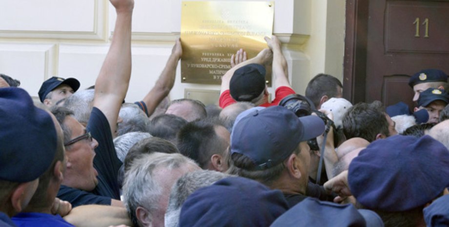 Демонстранты протестуют против информационных табличек, написанных на сербском языке.