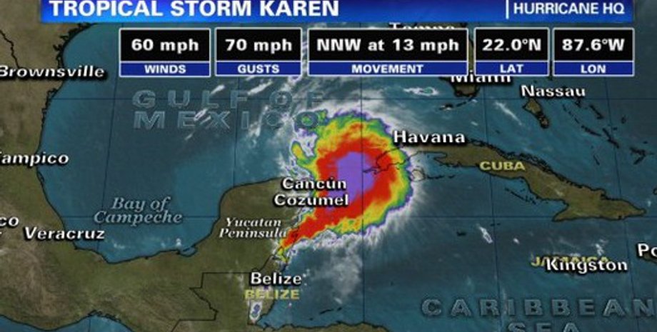По расчетам специалистов, Карен может через три дня обрушиться на штаты Луизиана, Флорида, Алабама и Миссисипи.