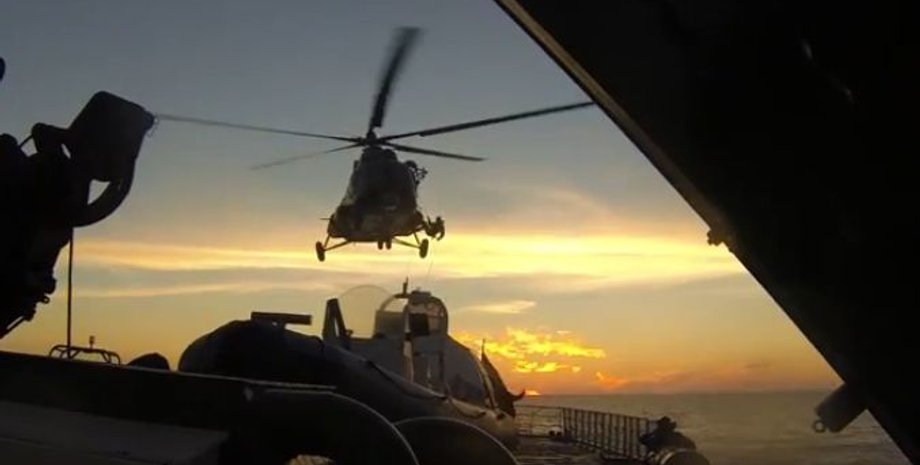 На видео запечатлен момент высадки с вертолета на борт судна вооруженных сотрудников Федеральной службы безопасности России.