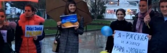 Участники акции исполнили гимн Украины, звучали возгласы: "Слава Украине!", и, как можно наблюдать из представленного видеоролика, обыватели реагировали на происходящее абсолютно спокойно.