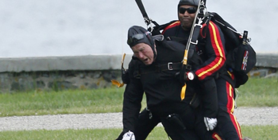 Буш, страдающий болезнью Паркинсона и вынужденный передвигаться в инвалидной коляске, совершил прыжок с вертолета в тандеме с опытным армейским парашютистом