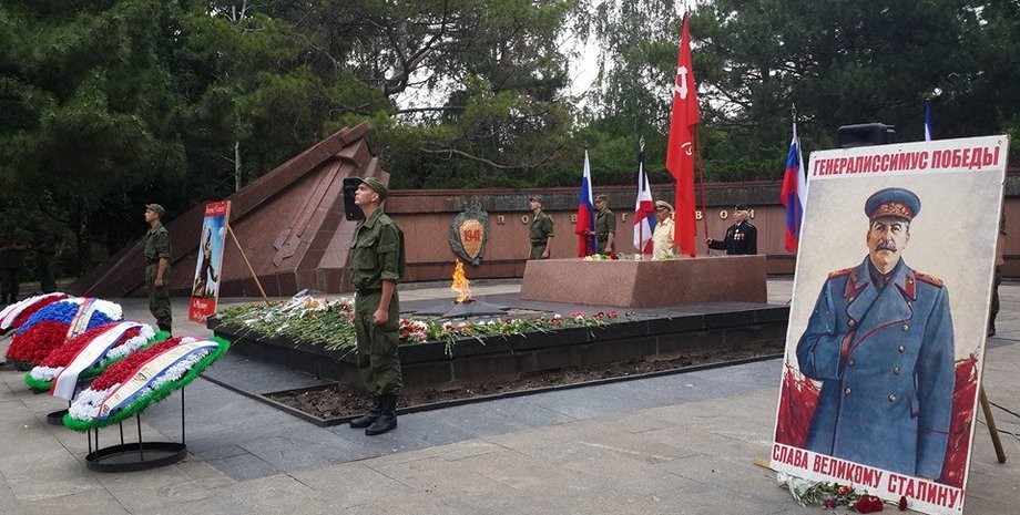 Возле вечного огня в Симферополе появился плакат, прославляющий Сталина, пишет издание "15 минут".