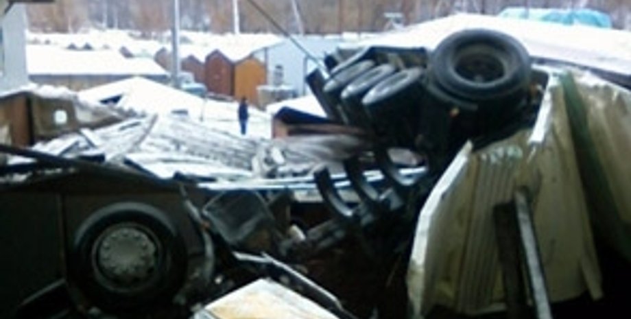 Грузовик "Рено" следовал в сторону Харьковского массива. Он сбил ограждение моста и упал на расположенные внизу гаражи.