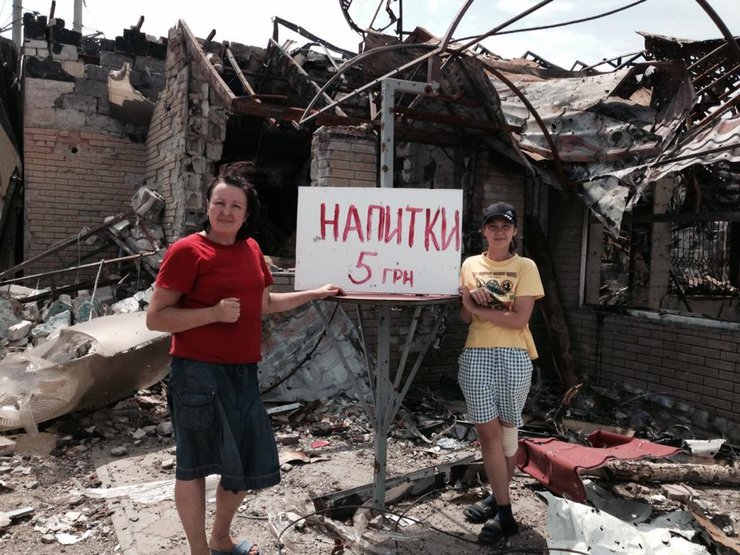 У Вовы есть старшая сестра - Надя. Раньше у семьи был продуктовый магазин. Его тоже разбомбили. Теперь Надя на развалинах установила самодельный плакат с надписью, сделанной красным маркером - "Напитки 5 гривен". Рядом поставила ведро со льдом и аккуратно уложила несколько бутылок минеральной воды и "Пепси". Это все что осталось от некогда процветающего бизнеса. Когда снаряды попали в магазин девочки-продавщицы были внутри. Чудом никто из них не погиб. Отделались испугом и мелкими царапинами.