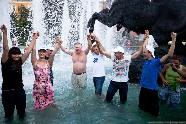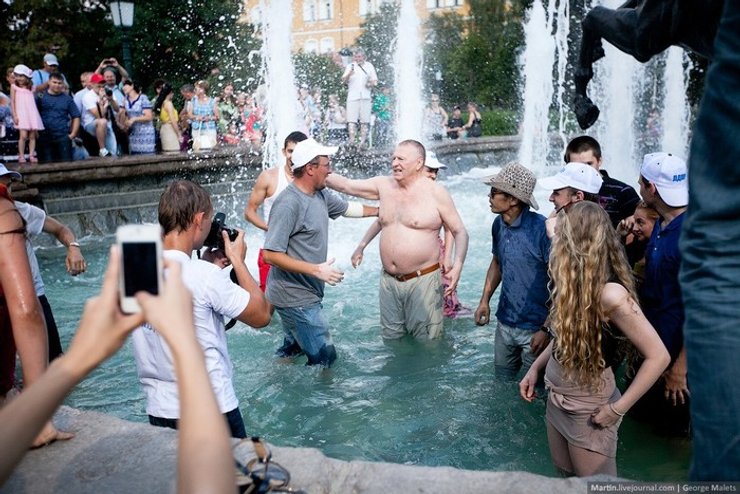 На внезапную "тусовку" в фонтане с лошадьми сбежались зеваки и туристы. Скандальный политик затаскивал в воду народ, кричал "Мы не боимся жары!" и раздавал мороженое.