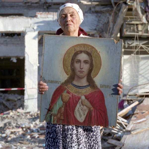 От бомбежки спряталась в подвале разрушенного дома на улице Мира, 11, в котором прожила более полувека. Когда все стихло, увидела, что ее квартиры на четвертом этаже больше нет. Варвара Андреевна вытащила из-под завалов три иконы. Одну из них — святой Варвары — в 1947 году написал ее дед. Он рассказывал, что этот образ явился ему в облаке тумана над рекой.