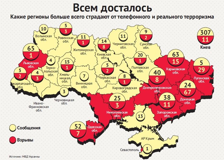 Нередко балуются пьяные. За такие шутки можно сесть на несколько лет, "террористов" регулярно находят, но ложных вызовов не становится меньше. После выпивки бесстрашие берет верх над разумом: звонят даже с мобильных телефонов, которые легко отследить. В последнее время чаще всего поступают звонки из Донецкой и Луганской областей. Сообщают о минировании объектов в Киеве и в западных регионах страны.